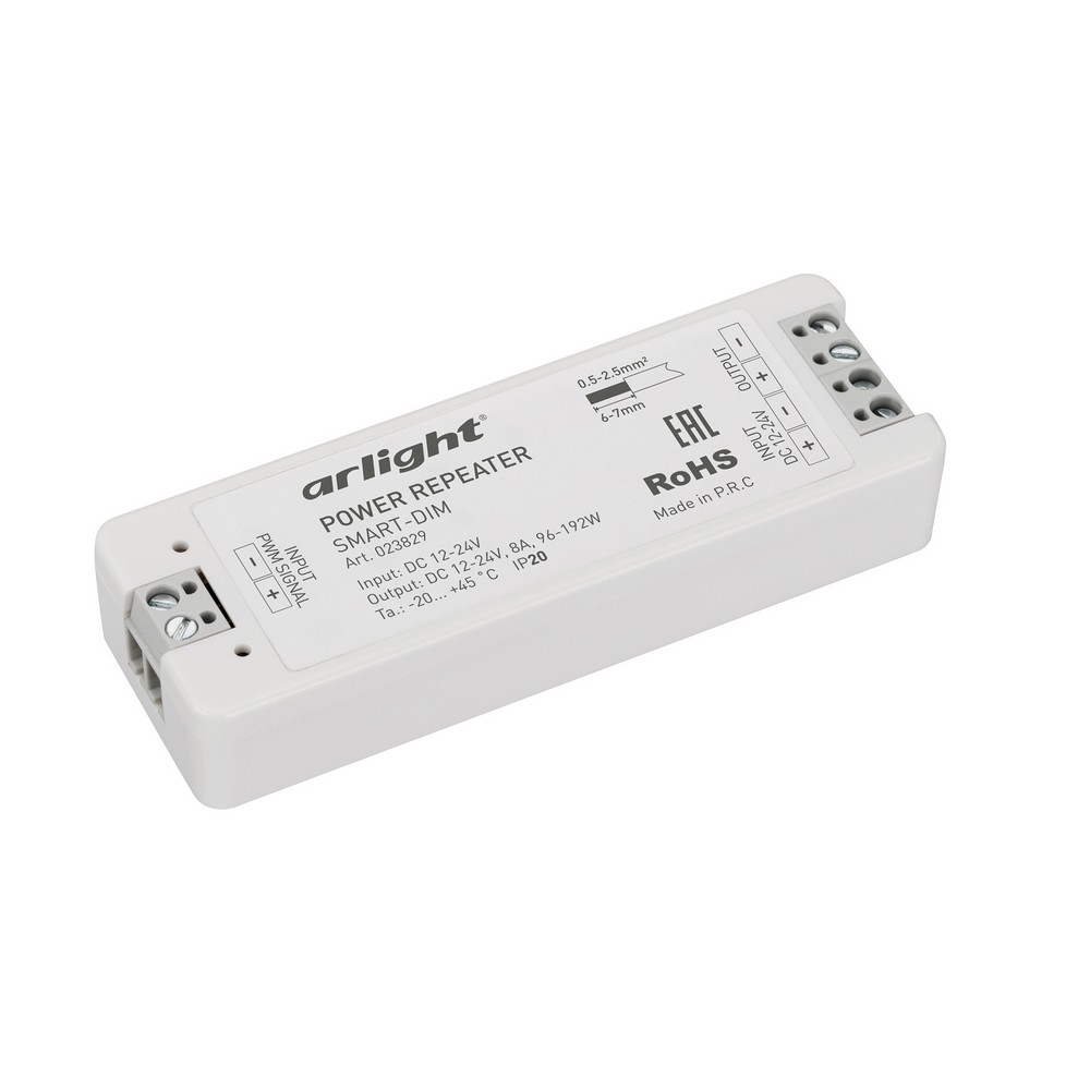 Диммер для монохромной светодиодной ленты (ШИМ). Питание/рабочее напряжение 12-24VDC, максимальный ток 8A на канал, 1 канал, максимальная мощность 96-192W. Винтовые клеммы. Корпус - PVC. Габариты 97x33x18 мм. Управляется пультами и панелями серии SMART (поставляются отдельно).