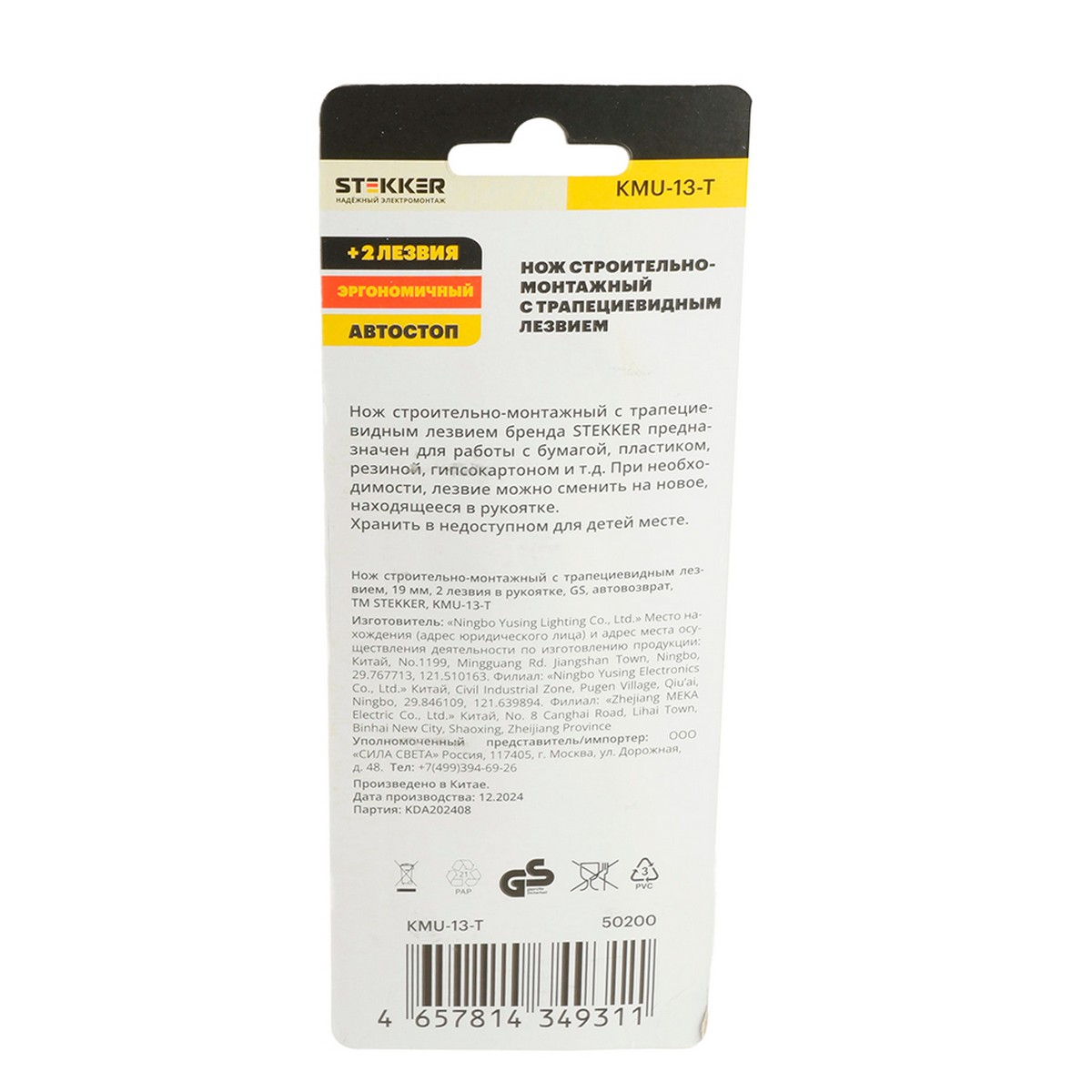 Нож строительно-монтажный с трапециевидным лезвием, 19 мм, 2 лезвия в рукоятке, GS, KMU-13-T 50200 по цене 267 руб. с фотографией и техническими характеристиками. Для покупки товара нажмите кнопку "Купить" и перейдите в корзину или позвоните по телефону 8 (495) 585 32 60 или 8 (800) 222 23 53.