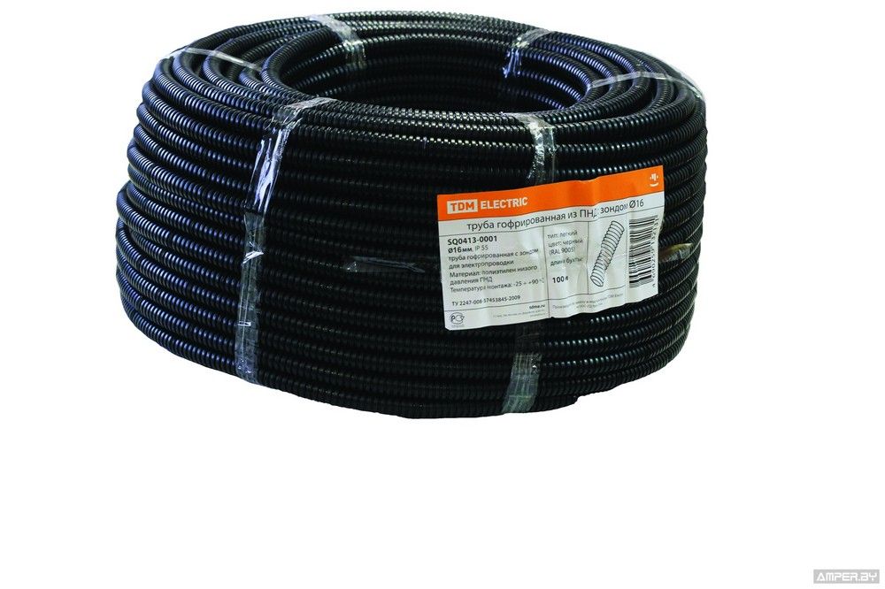 Диаметр - 16 мм. Материал – самозатухающий поливинилохлорид (ПВХ). Цвет - серый. Гофрированные трубы из ПВХ легкой серии могут эксплуатироваться при температуре от – 25 °С до + 60 °С. Длина – 50 метров.