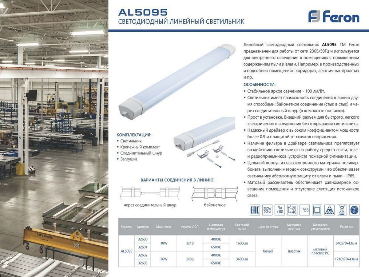 Линейный светодиодный светильник AL5095 ТМ Feron артикул 32603 предназначен для работы от сети 230В/50Гц и используется для внутреннего освещения в помещениях с повышенным содержанием пыли и влаги. Например, в производственных и подсобных помещениях, коридорах, лестничных пролетах и пр.