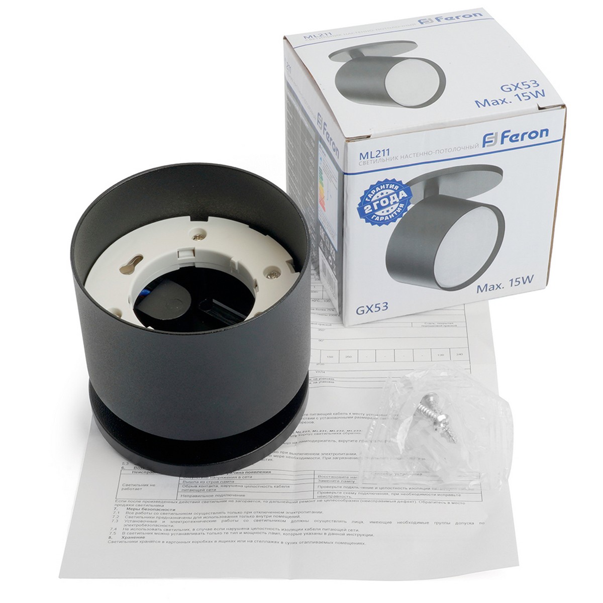 Современный светильник спот создаст уютное освещение в любом интерьере. Можно использовать как основное или акцентное освещение в любом помещении. Модель ML211 от производителя Feron в цвете Черный и типом лампы GX53 которая обеспечивает мощность 15 Ватт обеспечит Вас качественным светом. А универсальный крепеж (в комплекте) позволяет установить светильник на любую поверхность. Светильник накладной под лампу, (ИВО) FERON ML211, GX53 15W, 230V, IP20, цвет черный, корпус алюминий, 80*80*75