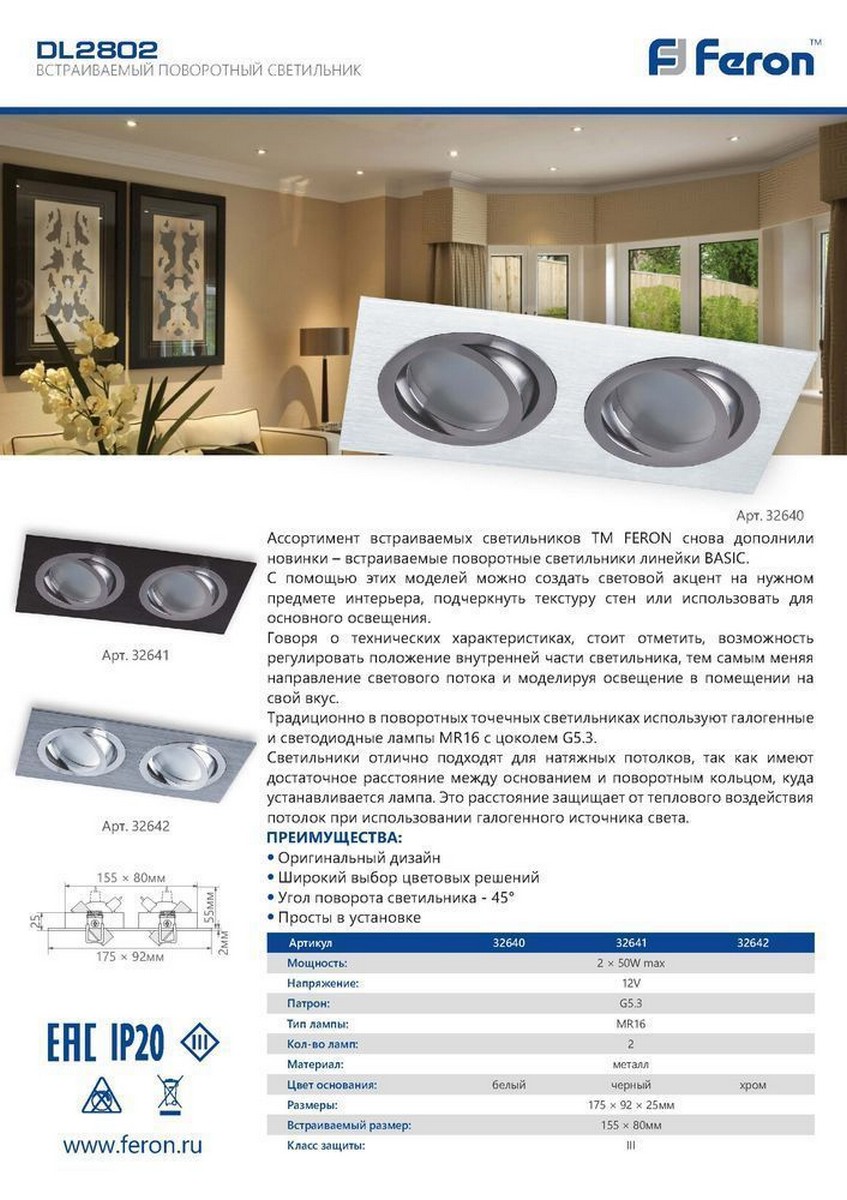 - Просты в установке Встраиваемый светильник можно устанавливать в натяжной, подвесной, гипсокартоновый или другие виды потолков. Скрытый монтаж позволяет спрятать основной механизм светильника. Модель из линейки DL2802 от производителя Feron с типом лампы MR16 и цветом Хром идеально подойдет для любого интерьера