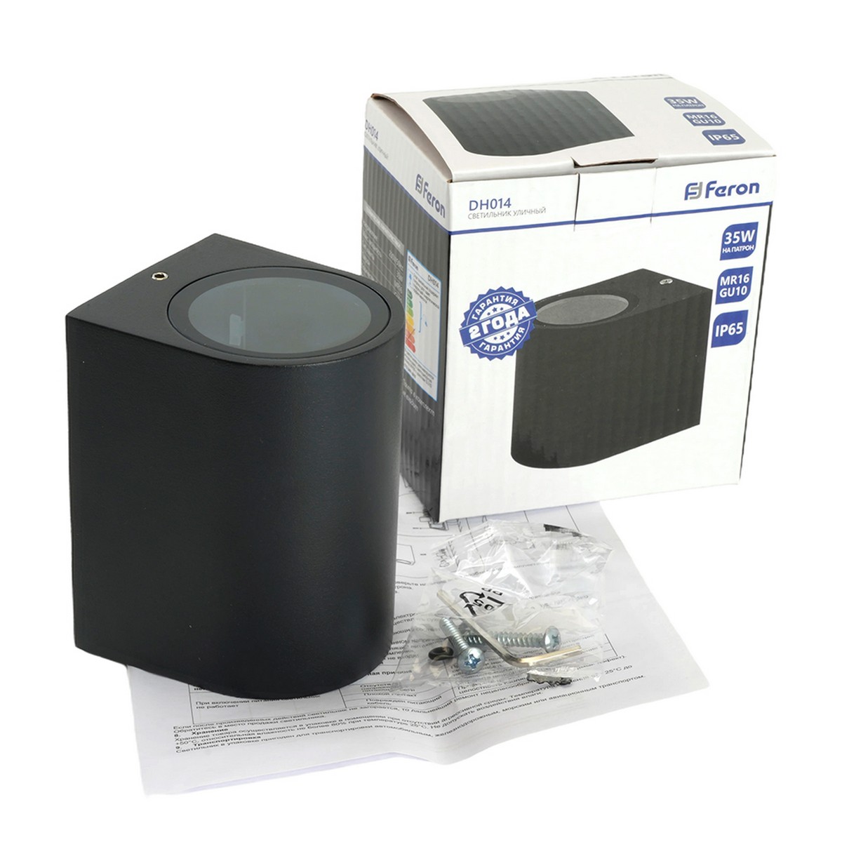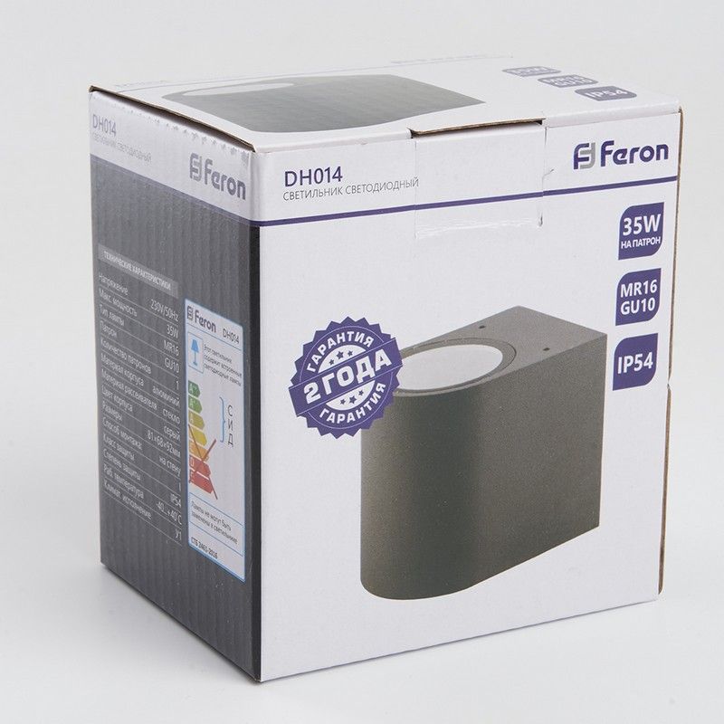 Feron DH014 оснащен цоколем GU10 и предназначен для работы от сети 230V. Он эффективен и экономичен с максимальной мощностью лампы 35W. Индекс защиты IP65 гарантирует защиту от пыли и влаги, позволяя использовать светильник в любых погодных условиях. Размеры модели составляют 78x68x100 мм, что делает ее компактной и не занимающей много места на стене.