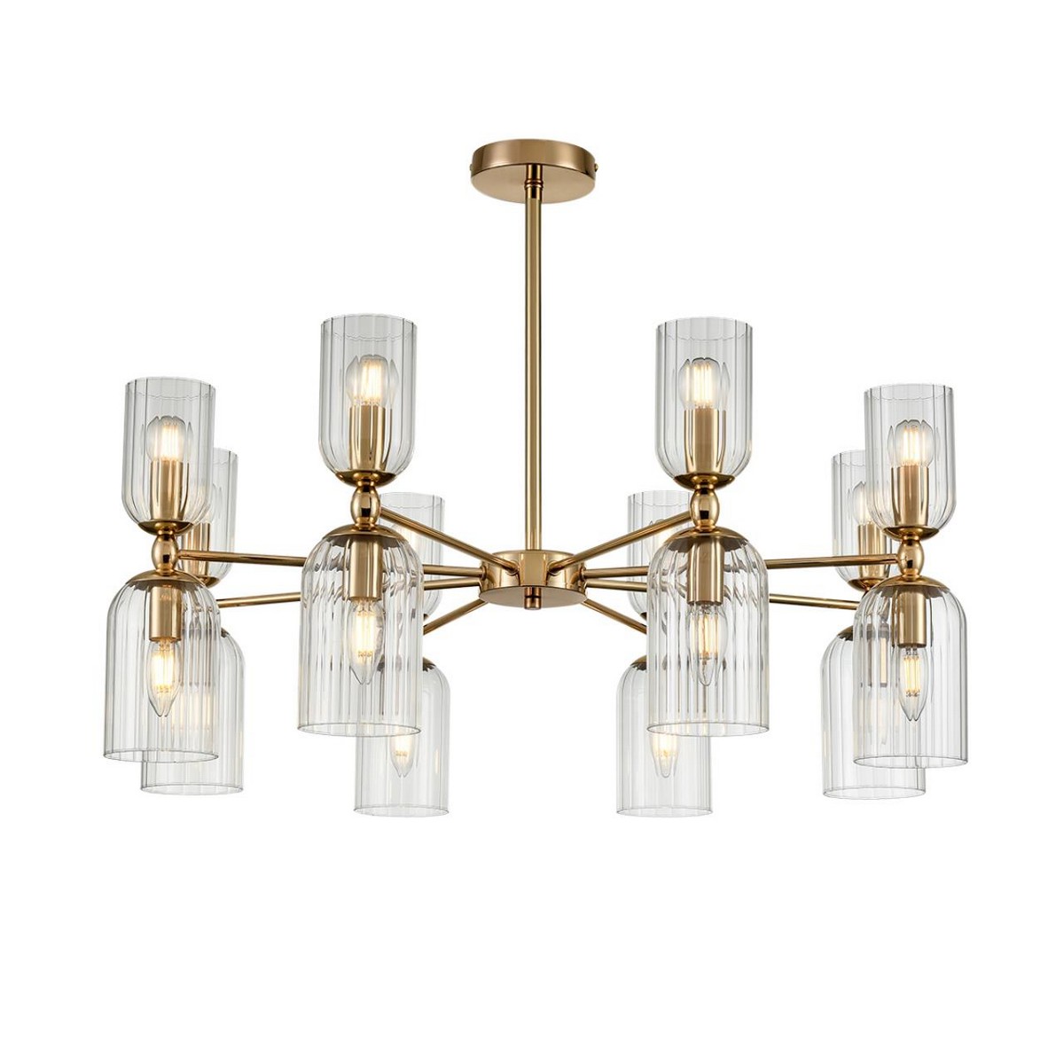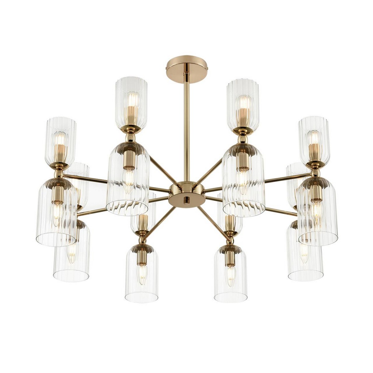 Линия светильников KASSIA станет оригинальным дополнением современных интерьеров. KASSIA сочетает металлический каркас в благородном золотом цвете и цилиндрические плафоны из прозрачного рифленого стекла. Плафоны меньшего размера направлены вверх, плафоны большего размера направлены вниз. Такое дублирование плафонов дает больше света и позволяет осветить большое пространство. В данной серии рекомендуется использование круглых небольших ламп в верхних плафонах и лампы в виде свечи – в нижних. Это добавит оригинальности и легкий ретро-акцент, который гармонично сочетается с современной стилистикой.Потолочные светильники KASSIA на 10 и 16 ламп станут центральным элементом в просторных залах, а утонченные бра дополнят уютную атмосферу вашего дома.