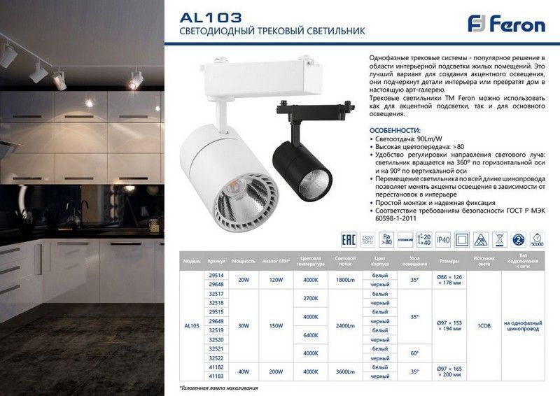 Трековые светильники ТМ Feron AL103 артикул 41183 можно использовать как для акцентной подсветки, так и для основного освещения.