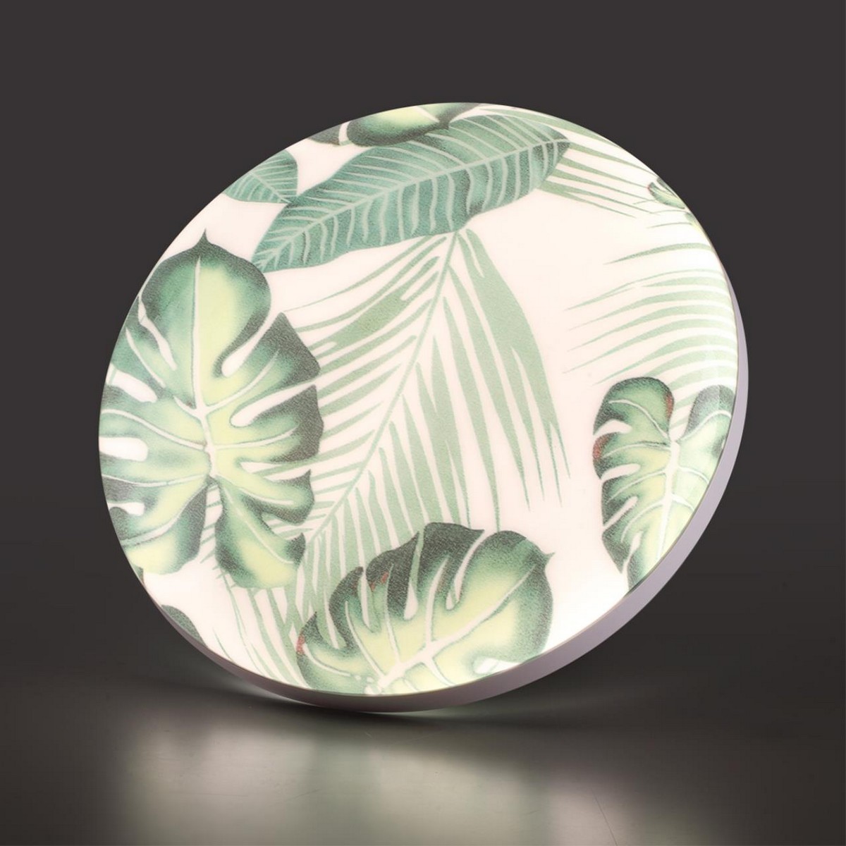 Светильник 7748/DL линии FLORI состоит из металлического основания (базы) и пластикового рассеивателя. Материал рассеивателя - высококачественный пластик марки PMMA 2.0 белого цвета с глянцевой поверхностью, обеспечивающий светильнику равномерное рассеивание и хорошее светопропускание. Форма плафона: круглая, декорирована орнаментом на плафоне с зеленым рисунком тропических листьев и съемным ободом белого цвета. Рисунок на плафоне выполнен методом цифровой печати по технологии прямого нанесения красок на акриловый лист. С целью предотвращения выцветания красок поверх рисунка наносится слой белой краски. После выдувания плафона при высоких температурах красочный рисунок приобретает стойкость и долговечность. Степень защиты IP43 позволяет использовать светильник в определенных зонах влажных помещений. В комплект входит заменяемый LED модуль с линзами, мощностью 48Вт, которая соответствует лампе накаливания 440Вт. А также пульт ДУ, с помощью которого осуществляется плавное изменение цветовой температуры 3000-600